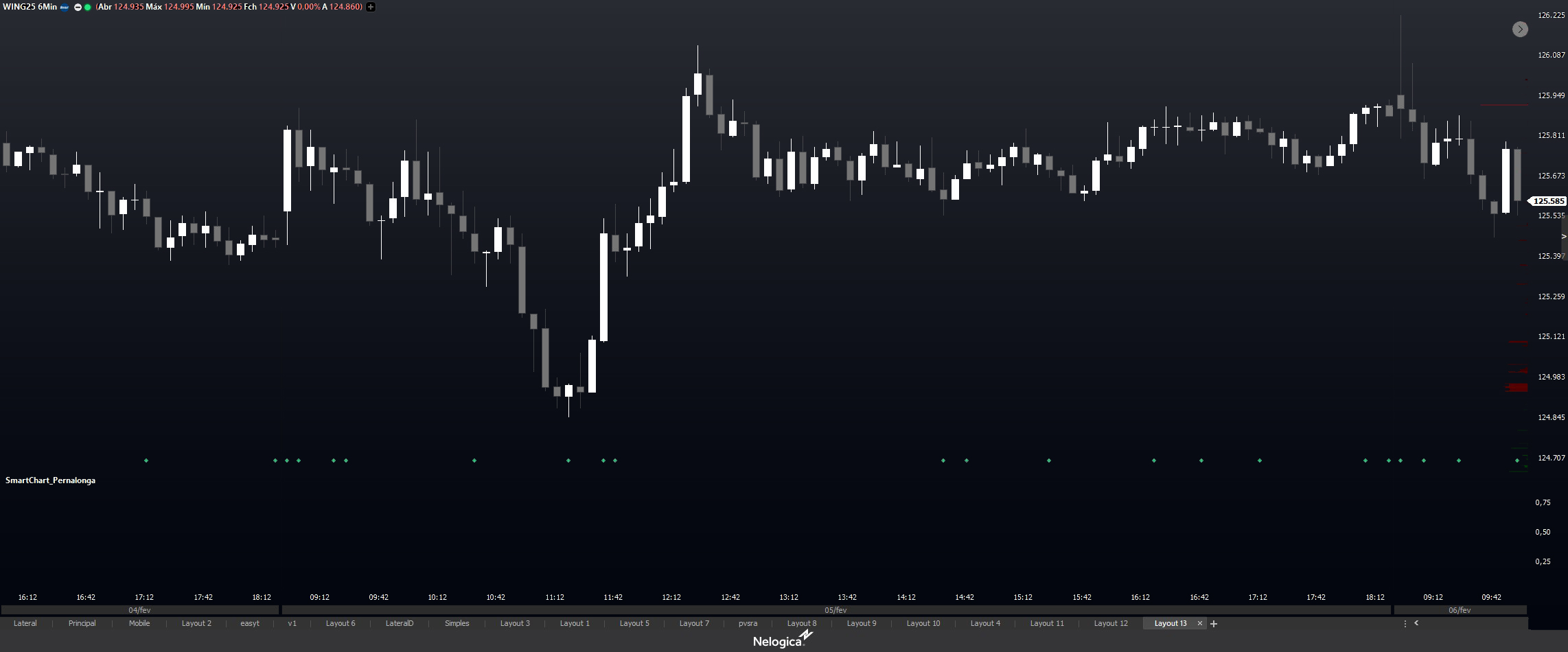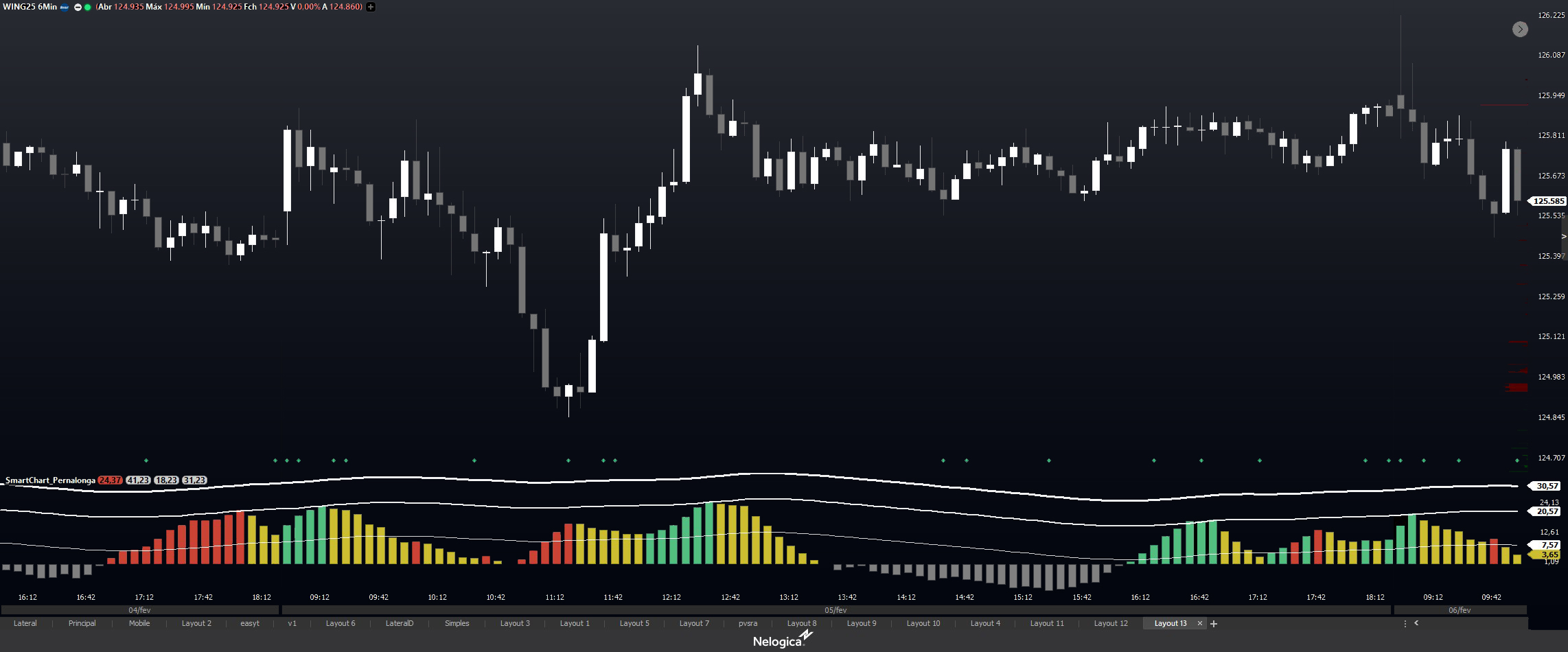 Quando o preço supera a expectativa da pernada, o indicador "Pernalonga" indica zonas de exaustão e possível reversão da tendência. Isso permite que os traders identifiquem oportunidades de entrada ou saída com base nas condições do mercado. Quando o indicador fica abaixo de 0, na coloração cinza, é um sinal de lateralidade no mercado.